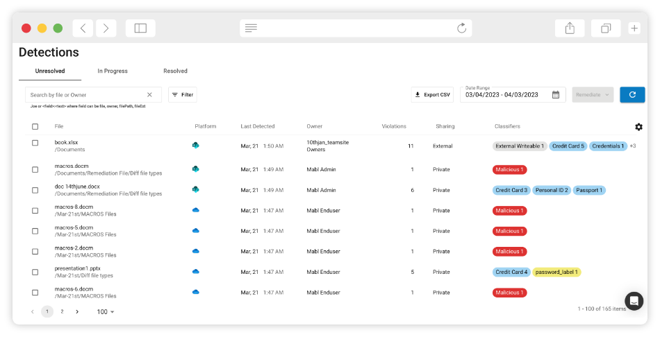 - Identifies risky content with sharing visibility – who has access, external shares – and flags potential leaks, or dormant threats missed by MS365 native tools.