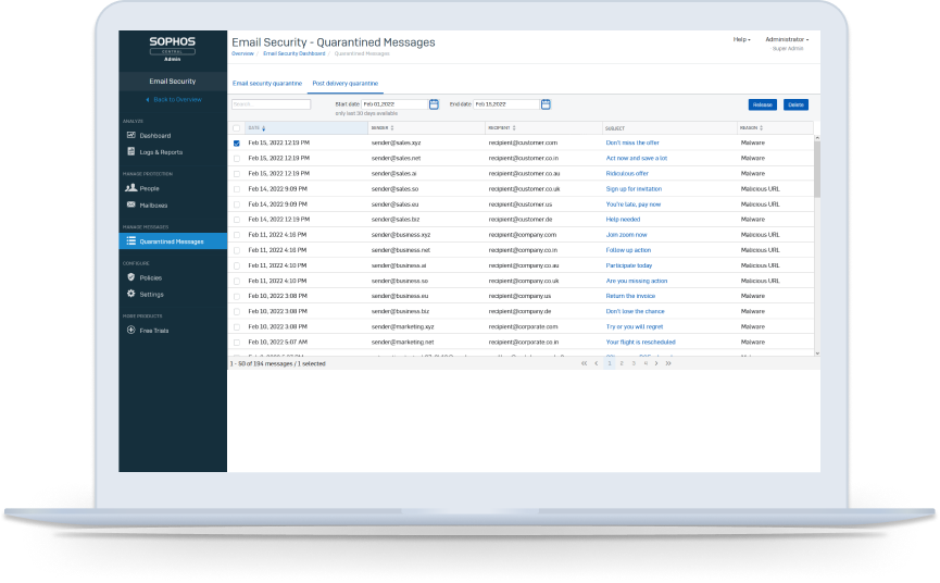 Sophos Email Security delivers comprehensive cloud-based protection against advanced email threats and data loss for organizations using Microsoft 365, Google Workspace and other services. It integrates AI-driven defenses with MDR/XDR for unified management and response. Compatibility spans all major email providers via MX redirection or APIs.
