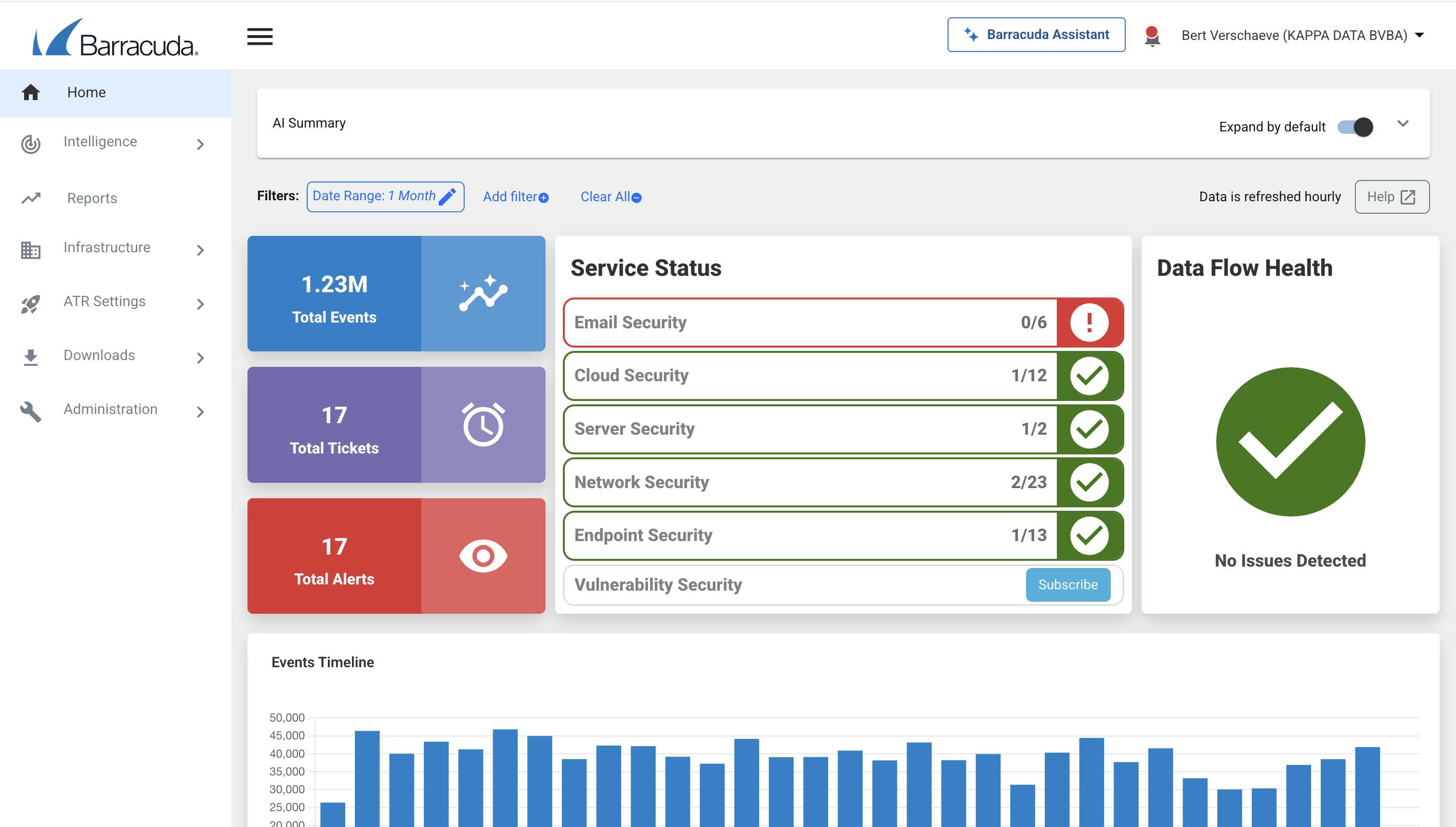BarracudaONE, the unified platform launched mid-2025, consolidates all these products into a single dashboard with AI-powered correlation, incident ase generation, and the Barracuda Assistant (generative AI copilot) providing real-time guidance during incident investigation and response